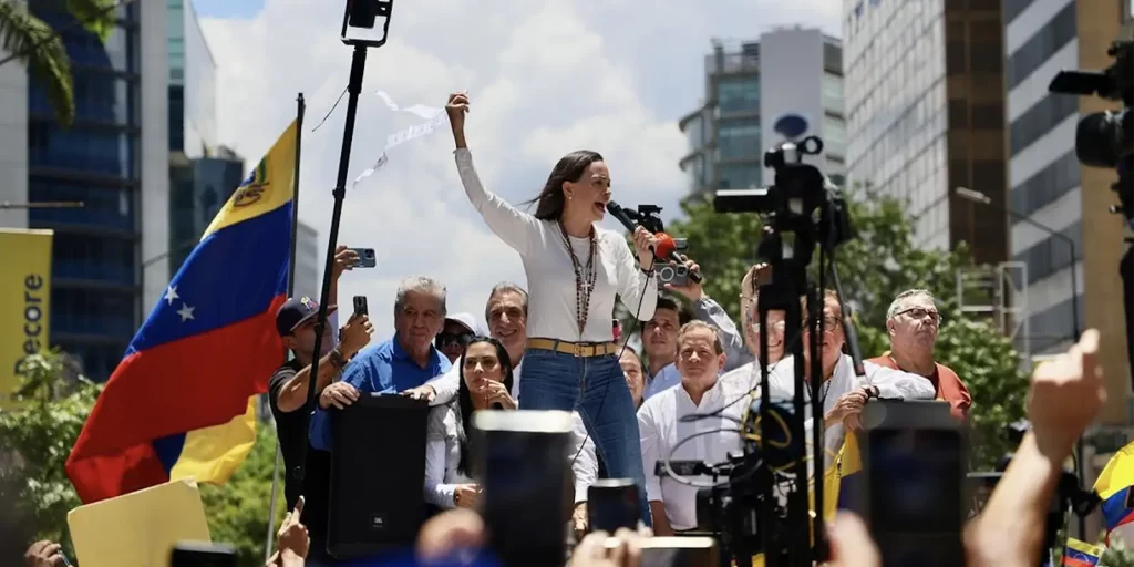 En 2002, el presidente democráticamente electo de Venezuela, Hugo Chávez, fue secuestrado y recluido en la isla La Orchila. Corina Machado (foto), varios empresarios y el New York Times apoyaron el golpe. La oposición proclamó a Pedro Carmona (empresario y miembro del Opus Dei) como nuevo presidente. Carmona decretó la disolución de la Asamblea Nacional, la Corte Suprema y otras instituciones. Machado firmó la declaración de apoyo a esas medidas.