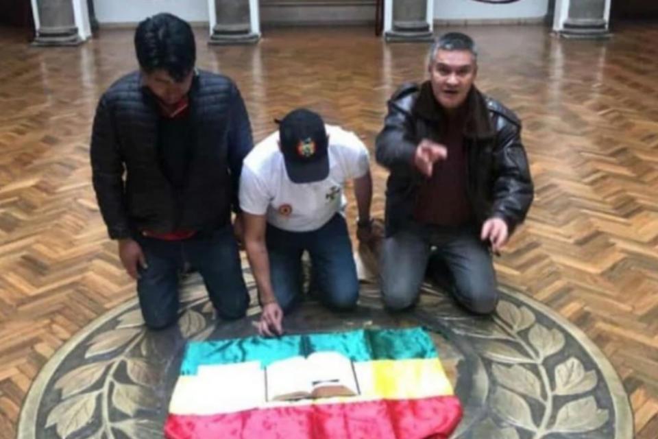 El líder cruceño Luis Fernando Camacho se presentó en la Casa de Gobierno, y ante la ausencia de Evo colocó su escrito sobre una biblia y la bandera boliviana arrodillándose en el piso. Es el mascarón de proa de una oposición financiada y estimulada por Estados Unidos, que no disimula lo que hará si gobierna.