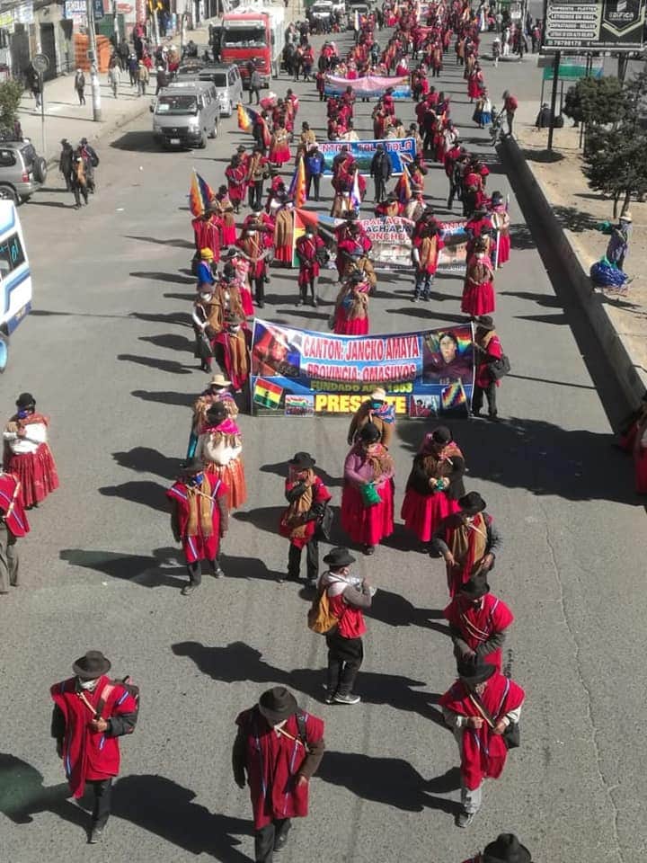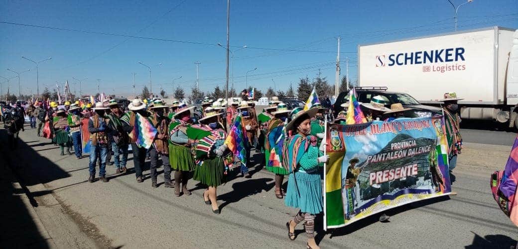 La movilización fue convocada a primera hora de la mañana en el simbólico lugar de Senkata, La Paz, donde el 19 de noviembre del 2019 ocurrió una masacre, desde donde millares de manifestantes marcharon rumbo a la región de la Ceja, donde se llevó a cabo un cabildo multitudinario.