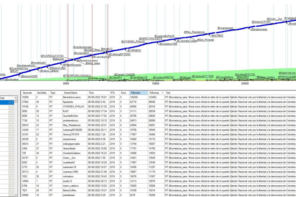De muchas de ellas podemos asegurar al cien por cien que son bots, porque hacen más de dos tuits o retuits por segundo. Por ejemplo, vemos una que hace hasta siete retuits en el mismo segundo y otra que hace más de 20 en sólo cuatro segundos. Pero lo más interesante es, si analizamos la actividad de estos perfiles, empezando por las que pusieron más tuits contra Glas, que todas retuitean cuentas colombianas contra Petro.