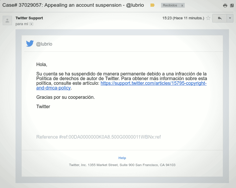 Dos correos enviados por la empresa Twitter también señalan que mi cuenta fue “suspendida de manera permanente”.