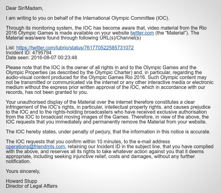 Según los correos enviados por la empresa Twitter, la causa se debe a reclamos realizados por el Comité Olímpico Internacional (COI) debido a que subí videos cortos, de no más de 90 segundos, sobre varios hechos ocurridos en los Juegos Olímpicos: