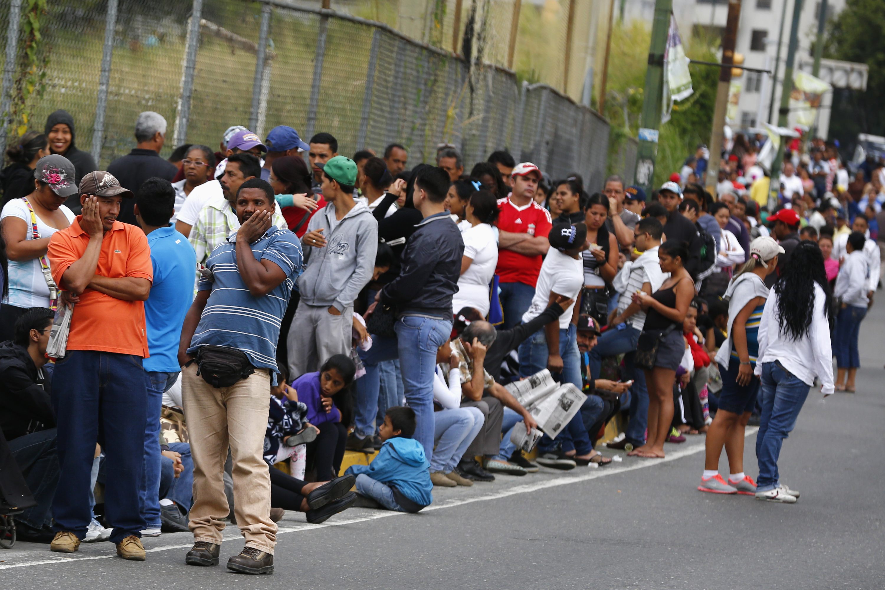 People line up outside a state-run Bicentenario supermarket in Caracas January 9, 2015. Lines swelled at Venezuelan supermarkets on Friday with shoppers queuing up by the hundreds to seek products ranging from chicken to laundry detergent, as a holiday slowdown in deliveries sharpened the OPEC nation's nagging product shortages. Queues snaked around the block at grocery stores and pharmacies around the country, with consumers in some cases gathering before dawn under the gaze of national guard troops posted to maintain order. REUTERS/Jorge Silva (VENEZUELA - Tags: POLITICS BUSINESS)