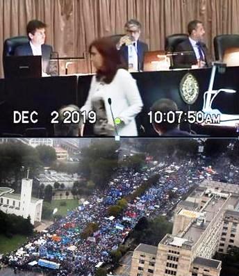El lunes 2 de diciembre terminó el periplo, lo hizo en el mismo edificio en el que había empezado todo, con una de las declaraciones judiciales más duras de la historia nacional. Entre las 9 y 50 y las 13 y 40 dio una clase magistral sobre la “guerra jurídica” (lawfare) a la que es sometida la dirigencia latinoamericana que se opone a los designios de las corporaciones económicas. Explicó la maniobra del gobierno saliente dedicada a “condenar el gobierno de Néstor Kirchner y traer de vuelta al Fondo Monetario Internacional” para “robarse todo, mientras endeudaban al país”.