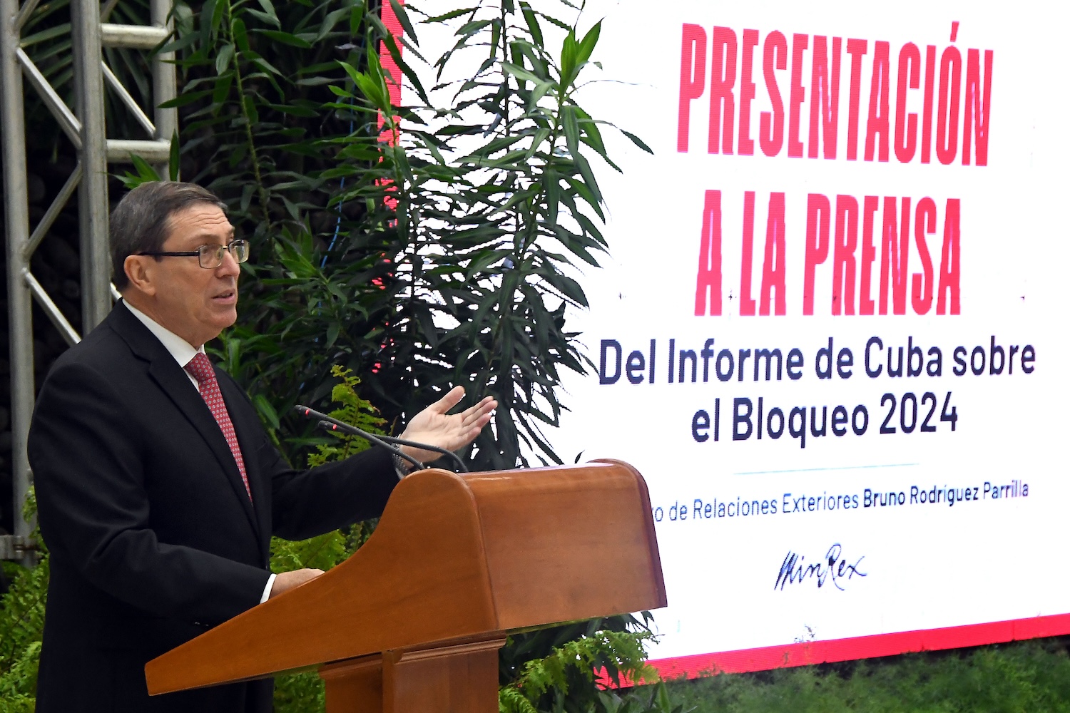 El ministro cubano de Relaciones Exteriores, Bruno Rodríguez, durante la presentación del informe “Necesidad de poner fin al bloqueo económico, comercial y financiero impuesto por los Estados Unidos de América contra Cuba”. (Xinhua/Joaquín Hernández)