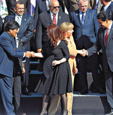 Evo Morales, presidente de Bolivia, criticó el modelo de libre mercado e insistió en su “diplomacia de los pueblos” para hallar solidaridad y complementariedad de los países de la región. Dijo que “estamos acá para compartir nuestras experiencias de trabajo permanente en defensa de la vida, por la igualdad y la dignidad en la unidad de nuestros pueblos”.