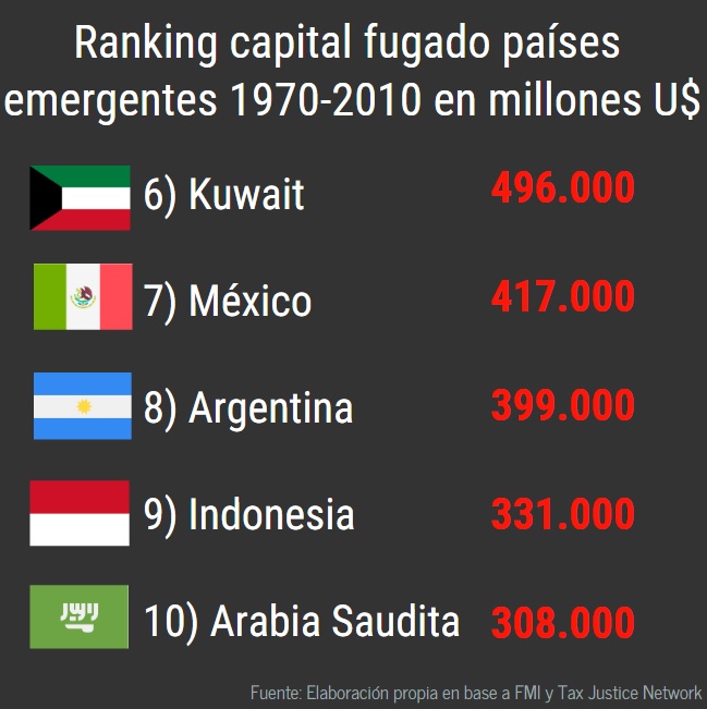 Décadas de endeudamiento externo, inestabilidad económica, permisividad estatal frente a la evasión y lavado de dinero han permitido que un volumen importantísimo de divisas se haya fugado del país. Al año 2010 –se estima que luego del proceso de fuga promovido por el gobierno de Mauricio Macri las cifras sean bastante más grandes- la Argentina se encontraba octava en el ranking de economías emergentes por stock de capital fugado.