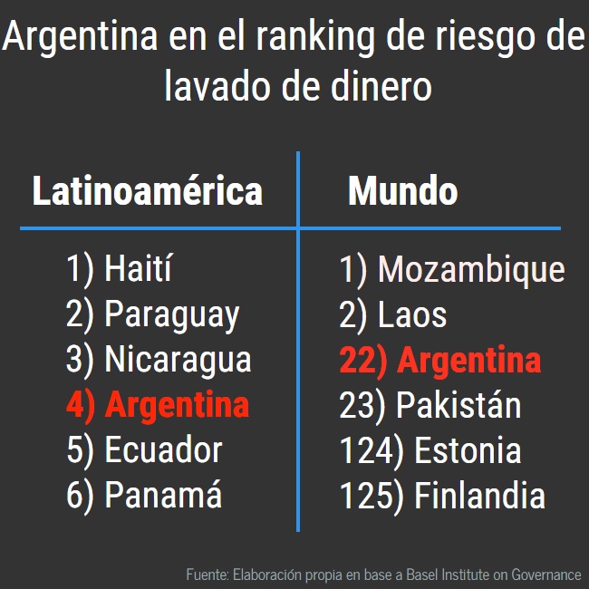 En lo que respecta a la posibilidad de lavar dinero, la economía argentina presenta una condición realmente preocupante, pero completamente en línea con el nivel de evasión existente: en un país con índices de evasión tan altos es esperable que el lavado de dinero no sea difícil. Argentina se ubica cuarta en el ranking de las Américas y está 22° en el ranking mundial.
