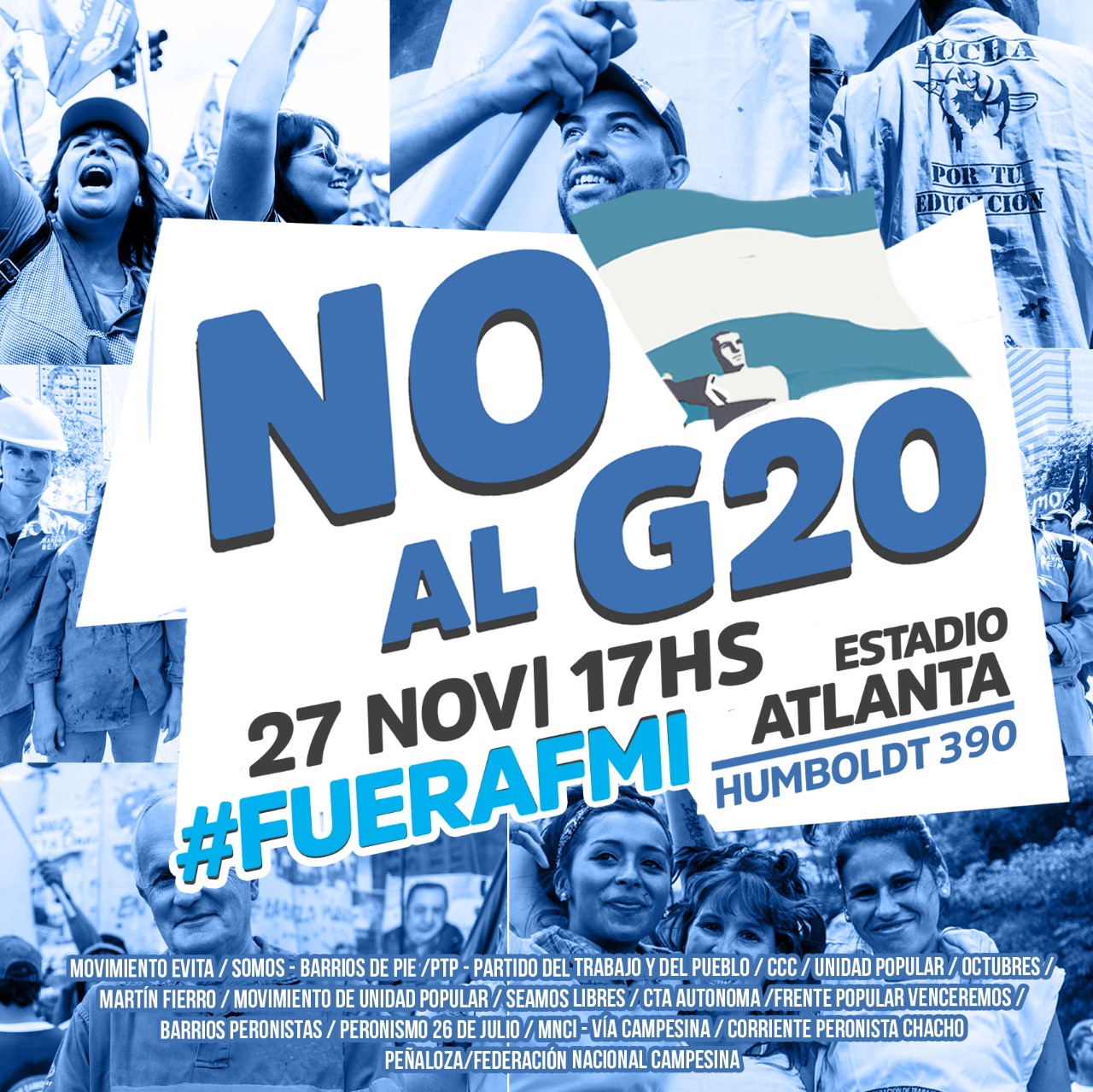A pesar de las amenazas y las campañas de amedrentamiento, organizaciones como el Movimiento Evita, Somos – Barrios de Pie, Corriente Clasista y Combativa, MNCI – Vía Campesina, opuestas a las políticas excluyentes del gobierno y que intentan construir una agenda alternativa que garantice “el acceso a Tierra, Techo y Trabajo para todas y todos los que habiten el suelo de nuestra Patria”, decidieron expresar su rechazo a la cumbre y convocaron a un acto en el estadio porteño de Atlanta el martes 27 bajo la consigna “No al G20. Fuera el FMI”, además de sumarse a las marchas, actos y cacerolazos que se realizarán en cada localidad del país el viernes 30 de noviembre.