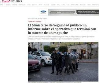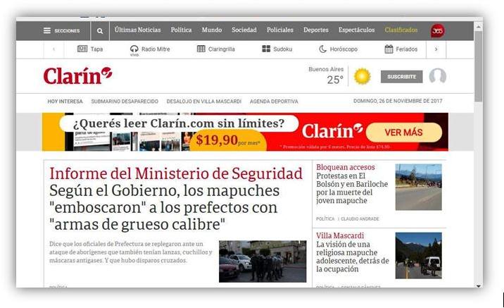 En el acto, la web del Grupo de Magnetto y los Noble, reflejó la versión en la nota central de su portal a través de un título que, si no 3 portal clarin previofuese que abría el anuncio de la tragedia, daba para la ironía ya que piedras, boleadoras y lanzas habían podido con los comandos Albatros de Prefectura, que cuentan con fusiles FAL de asalto calibre 7,62 x 51, SIG SauerSwatt 556 y 3000, Blaser R93 LRS (para francotiradores), Remington 700 y HK G3; subfusiles HK M-P5, calibre 9 mm Parabellum; carabinas M4, versión del fusil M-16 adecuada al combate a corta distancia; ametralladoras MAG; escopetas Benelli M4 modelo 11707, Valtro y SPAS 15; lanzagranadas HK 69, entre otros chiches bélicos, con dotación reforzada o comprada durante la presente gestión, que invirtió en pertrechos para sus fuerzas de seguridad y con destino a operaciones represivas, más que  sus colegas de Defensa en mantenimiento de submarinos como el  ARA San Juan.