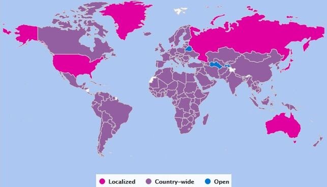 Cierre de escuelas a nivel mundial según los datos actualizados de la UNESCO. En rosa, los países que han decretado cierres localizados. En morado, los que han extendido la medida a todo el país. En azul, los que mantienen las aulas abiertas.