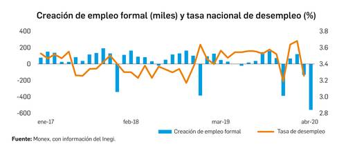 En abril último se perdieron 555 mil 247 puestos de trabajo en México, la cifra histórica más alta para un mes desde que hay registro, a causa de la emergencia sanitaria por la pandemia de Covid-19, que ha dejado unos 40 mil contagiados y cuatro mil muertos