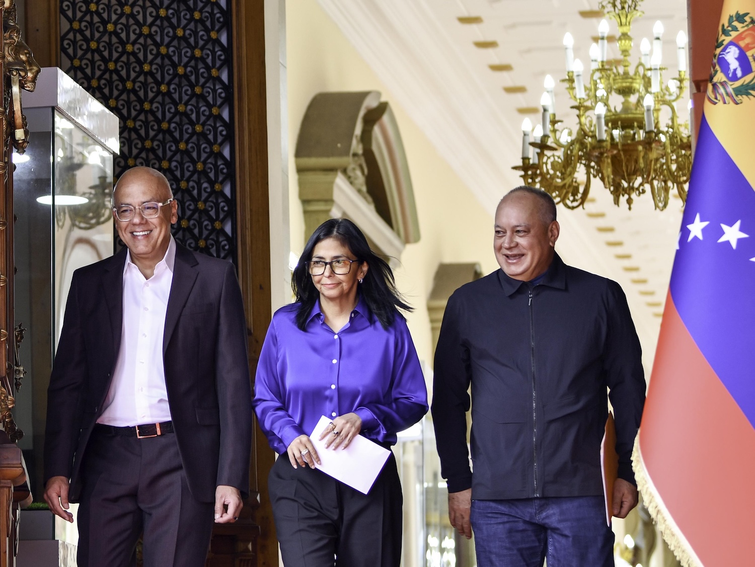 La presidenta encargada de Venezuela, Delcy Rodríguez (c), el presidente de la Asamblea Nacional de Venezuela, Jorge Rodríguez (i), y el ministro para Interior, Justicia y Paz venezolano, Diosdado Cabello. (Xinhua/Ding Hongfa)