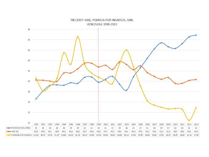 Pero yendo al grano, en cuanto al crecimiento del PIB la imagen habla por sí misma. Digan lo que digan, lo pongan como lo pongan, lo cierto es que la economía venezolana medida con el más convencional de los indicadores que puede haber, es más grande –sustancialmente más grande- después de Chávez. Pero no solo es más grande. Sino que la evolución de dicho crecimiento tiene una correlación positiva con la disminución de la pobreza y la mejora en la distribución del ingreso. Es decir: no solo es más grande, sino más justa e inclusiva.