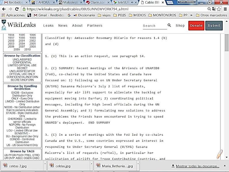 Los malestares británicos, alemanes e italianos con la gestión Malcorra, al punto de proponer saltear la coordinación con la ONU y operar de modo directo, y la aceptación de las propuestas de los EEUU por parte de la funcionaria argentina, quedaron documentados en veinte despachos del Departamento de Estado fechados entre 2008 y 2009, que mencionan a la actual canciller argentina, insertados en su sitio por wikileaks.orgen 2012.