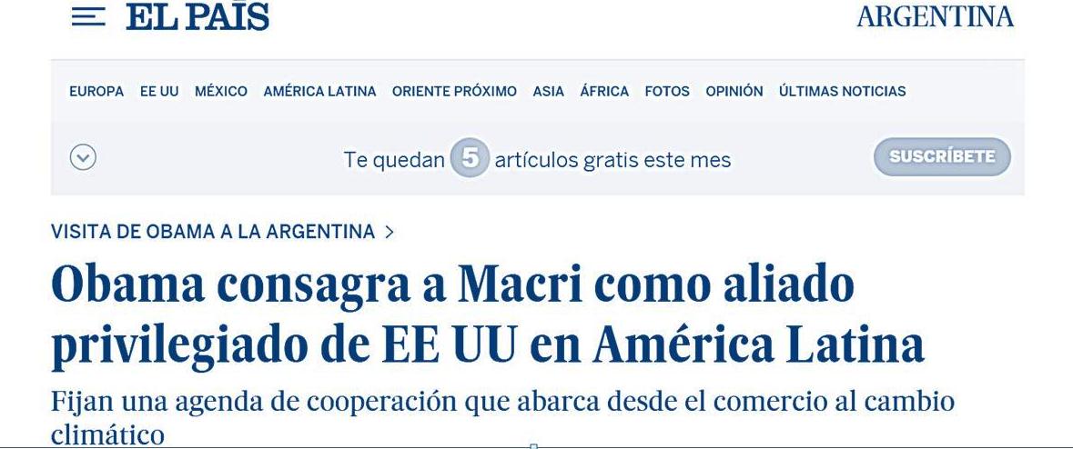 Con sus sonrientes 55 años y sus bombardeos e invasiones a países como Siria, Afganistán, Pakistán, Yemen, Somalia, Libia o Irak perpetrados desde su asunción, Barack Hussein Obama II otorgó en marzo de 2016 su bendición al presidente Mauricio Macri, a quien definió como alguien que “reconoce que nos encontramos en una nueva era y que debemos mirar para adelante”, interesado en “permitir que personas increíblemente talentosas, con maravillosos recursos naturales, prosperen de un modo que no ha ocurrido por mucho tiempo”, a diferencia de los doce años de kirchnerismo, que “debilitaron” al país “por no haberse adaptado a la economía mundial tan eficazmente como hubiera podido”.
