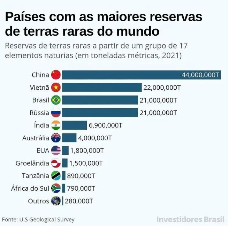 El siguiente gráfico nos ayuda a visualizar el tamaño y la ubicación de las principales reservas mundiales de tierras raras. Esta información es importante porque este escenario representa una nueva oportunidad para Brasil, que no debe desaprovecharse. Un escenario de anomia tecnológica y económica significaría que estos minerales, presentes en nuestro subsuelo, podrían convertirse en polvo si no se exploran y procesan adecuadamente en el país.