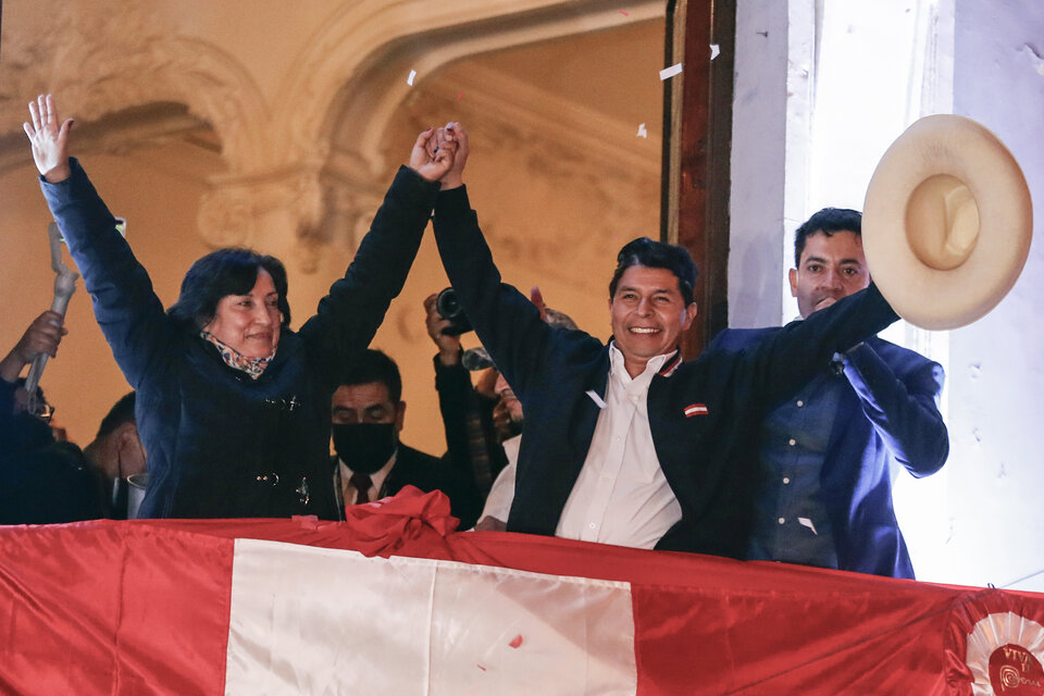 Castillo, con su sombrero blanco de ala ancha típico de los hombres de campo de la región andina, salió al balcón del segundo piso de la sede partidaria, acompañado por su vicepresidenta, Dina Boluarte, e inmediatamente hizo un llamado a la unidad, en medio de una campoaña de la derecha y del establishment para dividir el país, con llamados golpistas a no reconocer la legitimidad del nuevo presidente.
