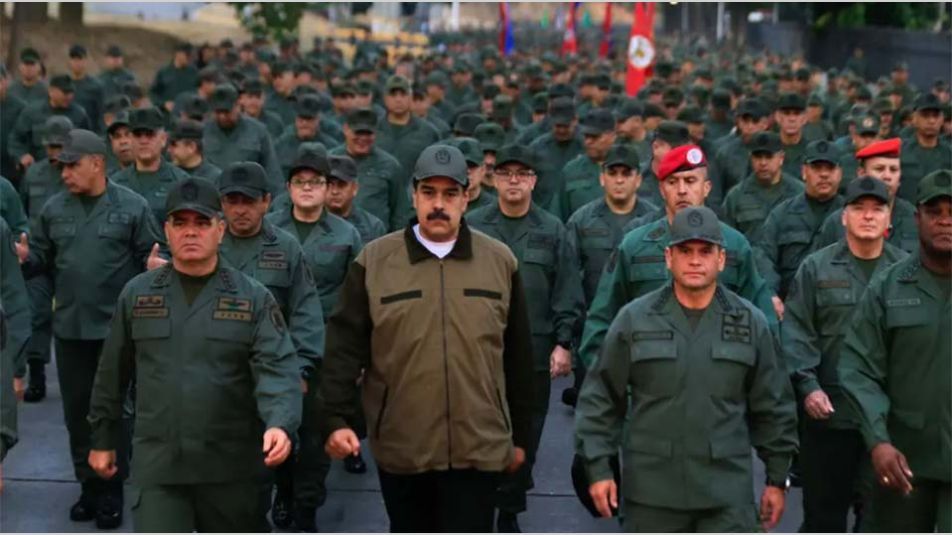Militares con cinta azul cerca de la Base Aérea “La Carlota” en Caracas, Venezuela, el 30 de abril de 2019.Más allá de todo esto, la realidad es que no tienen un apoyo militar ni popular, lo que deja en claro que no se trató de un golpe militar sino escaramuzas que le dan un sustento “social” a un accionar terrorista mayor como es el asalto a cuarteles, atentados de todo tipo, homicidios y el intento de magnicidio contra Nicolás Maduro.